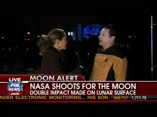 Fox News had reporter Claudia Cowen at some viewing party where the people were “crazy about the moon,” according to Steve Doocy. How crazy? “Did you see the impact just now on the big screen?” asked Cowan to a guy in afull Star Trek uniform. “They said it impacted but i didn’t see anything,” he said:
