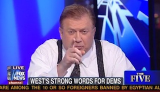 Beckel’s co-hosts all tried to defend West but they did little to dissuade his offense. Greg Gutfeld tried to argue that, after listening to outspoken black liberals “for 20-30 years,” it was awesome to hear one for conservatives (Watch out you don’t dip into Ann Coulter “Our blacks are better than your blacks” territory there, Greg…). Dana Perino argued that West was just talking about “messaging” and doesn’t really want anyone to leave the country. Eric Bolling kept bringing up West’s service.