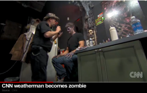 Fulfilling the lifelong and afterlifelong dreams of many, Marciano dressed in some (pretty impressive) zombie makeup in order to scare the living daylight out of hapless tourists. It made for a fun holiday segment while offering viewers a behind-the-scenes look at increasingly popular and elaborate haunted house attractions. You know, the kind where people jump out at you from dark corners. I’ll never visit one, personally, because 1) I’m chicken and 2) I ride the subway in New York, so I get my fill of the ghoulish and garish for a little less than $2.50 a ride.