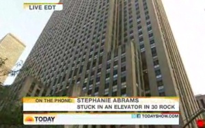 It’s safe to say that this morning’s weather report on the Today show was unlike any other before it. Filling in for Al Roker, The Weather Channel’s Stephanie Abrams found herself stuck in an elevator en route to the NBC Studio where she was set to join hosts Matt Lauer and Ann Curry. But a quick-thinking production staff reached Abrams on her cell phone and she was able to both explain her elevator plight AND deliver the weather. What moxie!