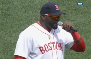 Designated hitter David Ortiz, better known to fans as “Big Papi,” took the mic for a short but effective speech to the crowd. “This jersey that we wear today, it doesn’t say Red Sox, it says Boston,” Ortiz began. “We want to thank you, Mayor Menino, Governor Patrick, the whole police department for the great job they did this past week.”