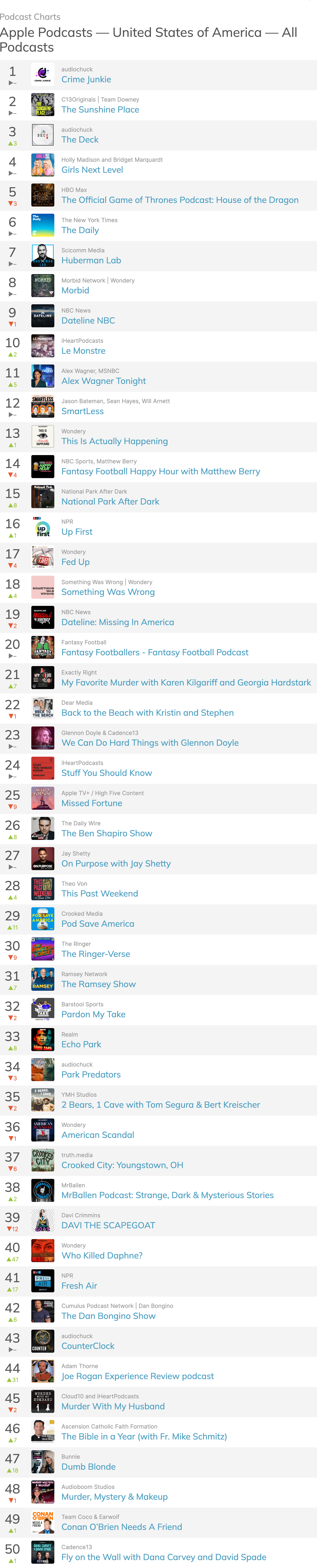 Following Crime Junkie is The Sunshine Place, The Deck, Girls Next Level, and The Official Game of Thrones Podcast: House of Dragon.