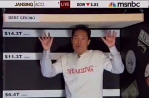 At one point Lui described that some economists think using language like “catastrophe” in the context of debt ceiling discussions is “unneeded theatrics.” And yes, Lui sincerely delivered that line while bouncing his head up against the “debt ceiling” and wearing a white t-shirt with “spending” spelled out across it. Mercifully, host Chris Jansing finally showed up to end the performance and inserted a moment of humor, which for the first time was intentional, commenting “MSNBC spares no budget for the clothing allowance.”