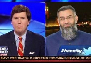 Tucker Carlson filled in for Sean Hannity on his show Friday night, and he brought on Anjem Choudary, a Muslim preacher responsible for an effort to threaten Muslim-owned business to stop selling alcohol lest they receive 40 lashes. Carlson confronted Choudary about this stunt and his desire to implement Sharia law in England.
