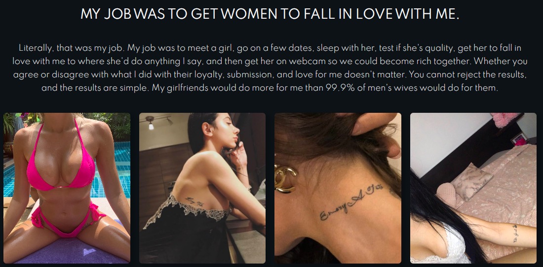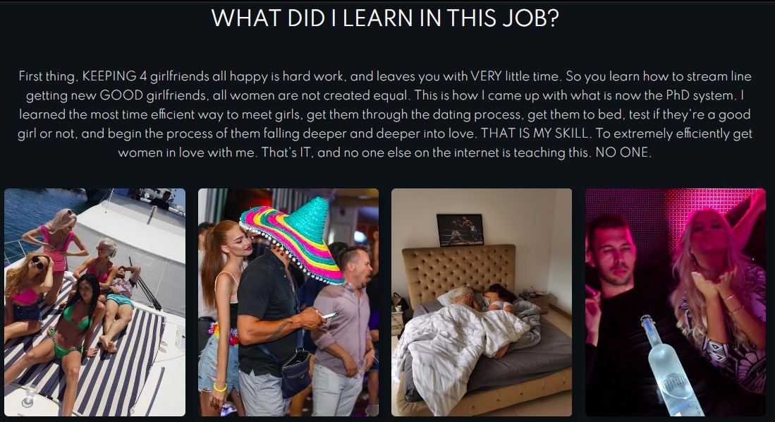 “I learned the most time efficient way to meet girls, get them through the dating process, get them to bed, test if they’re a good girl or not, and begin the process of them falling deeper and deeper into love,” he said.