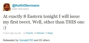Earlier tonight, now-former Countdown host Keith Olbermann sent his first tweet since his departure from MSNBC’s airwaves Friday. The subject? To announce that he would be sending his first post-Countdown tweet at 8pm Eastern time. The strange announcement is probably a humorous tweak at the speculation that ensued following an innocuous update to his Twitter profile on Saturday.