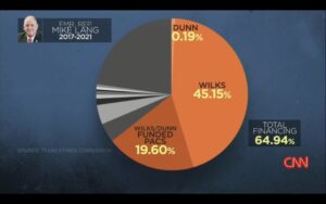 Texas campaign finance law allows unlimited donations to state candidates, making it possible for Dunn and Wilks — directly and through their various PACs — to underwrite staggering sums for their chosen candidates, sometimes providing a majority of their total contributions. Repeatedly throughout the special, CNN displayed a graphic like the one below showing the percentage of a GOP legislative candidate’s funds that came from these sources.