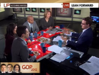 The sophomore week of MSNBC’s new morning show Up with Chris Hayes was charitable enough to bring with it an explosive 2012 Republican debate, and with that the potential fall of the GOP’s frontrunner. On the program this morning, host Chris Hayes and the panel couldn’t help but notice the “beaming joy” from Mitt Romney as he listened to Perry’s fledgling answers, and from that analysis ended up somewhere deep in the weeds of economic theory.