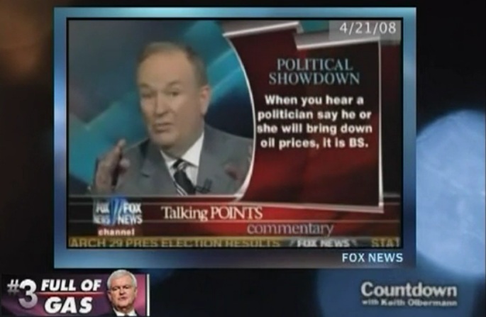 Former House Speaker Newt Gingrich has been trying to revive his flagging campaign with the promise of $2.50-a-gallon gasoline, while other Republicans have tried to attack President Obama over rising gas prices. The President has handled these attacks pretty well, but it’s nice to see him getting an assist from the folks over at Fox News, who echoed President Obama’s responses to gas price politics…three years before he gave them. Countdown’s Keith Olbermann has the video, including Bill O’Reilly‘s eerily similar remarks to President Obama’s, but in defense of President George W. Bush.