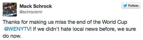 With five minutes left in Sunday’s World Cup final, WENY in Elmira, NY cut away for breaking news about the weather.
