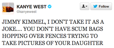 Jimmy Kimmel got an unexpected surprise Thursday evening when Kanye West unleashed a torrent of angry tweets on the late night host for a comedy sketch he aired comparing the rapper to a small child. Never one to waste an opportunity like this one, Kimmel discussed his “rap feud” on his show last night, offering a rebuttal to each and every tweet.