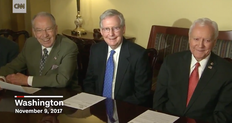 McConnell adopts that same blank-eyed smile he always wears when facing an uncomfortable situation. Senator Orrin Hatch can be seen beaming his pearly whites for the teeming mass of reporters, telling them to “settle down.”