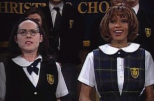 Everyone at Saturday Night Live must have been as shocked as the rest of the world to get the news that Whitney Houston died today at the age of 48, only a day before she was supposed to appear at the Grammys, and when she was due at a party in just a few hours. Given the short notice, there wasn’t much time to prepare a proper tribute. Instead, they put up a still photo of Houston’s appearance on the show with Molly Shannon, who was in character as Mary Catherine Gallagher.