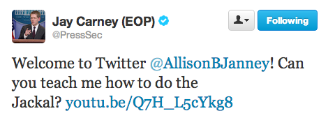 Janney also told Hall the story about how real White House Press Secretary Jay Carney recently welcomed her to Twitter by asking her to teach him how to do “The Jackal.”