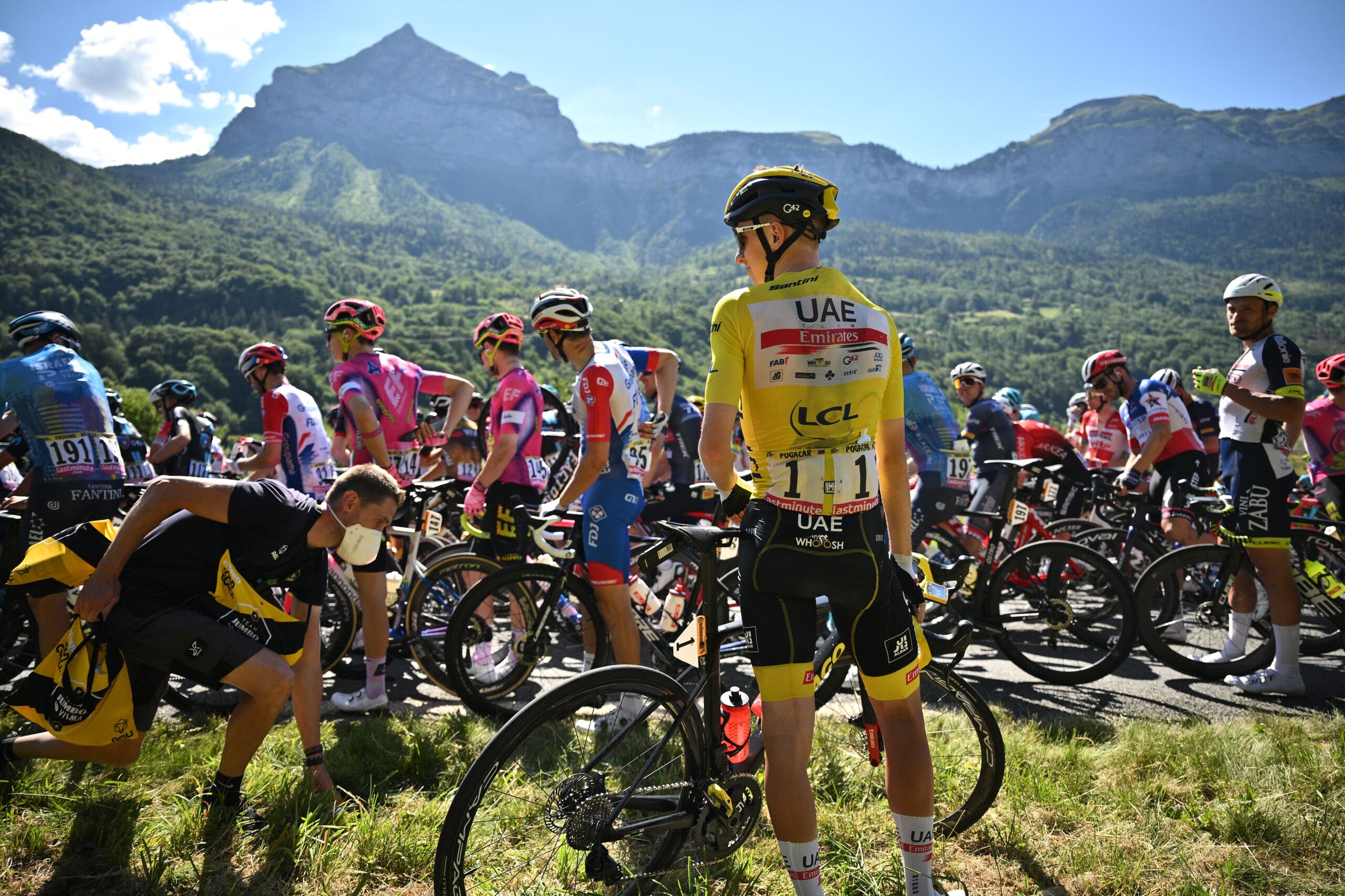 The frontrunner of the race, Tadej Pogačar, who has a lead of 32-seconds, was stopped by an official on a motorbike, notifying him that the entire race would need to pause.