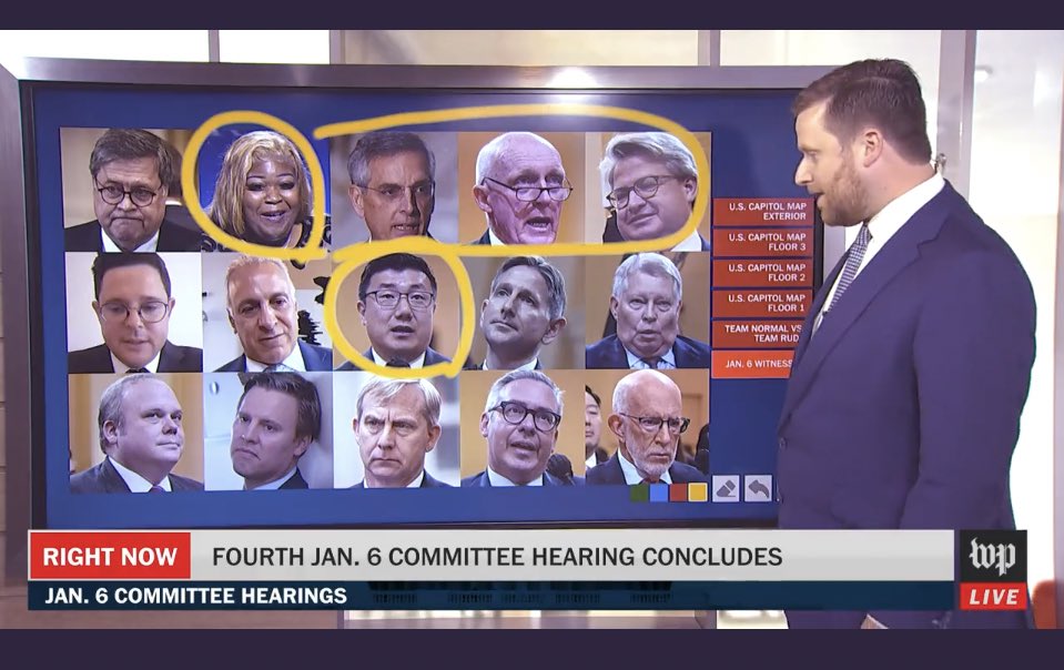 In the video, the Post‘s James Hohmann used a telestrator to connect witnesses Shaye Moss, Georgia Secretary of State Brad Raffensperger (R), Rusty Bowers and Gabriel Sterling on a screen.
