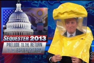 Jon Stewart entered full-on panic mode over the imminent across-the-board spending cuts with a segment Monday night for the recurring segment, “Sequester 2013: Prelude to the Return of the Barter System.”