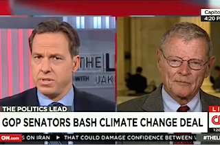 CNN’s Jake Tapper appeared to catch Sen. James Inhofe (R-OK) in a bit of a contradiction on Wednesday when he spoke to the likely new chair of Environment and Public Works Committee and avowed climate change denier about a new deal struck between the U.S. and China to reduce carbon emissions. Inhofe went on record saying he thinks China is getting off too easy in the deal, which led Tapper to ask, “Is that really your issue with the deal? I thought you didn’t think carbon emissions were a problem.”