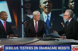During Health and Human Services Sec. Kathleen Sebelius’ testimony on Wednesday before a congressional committee following the problematic launch of the Affordable Care Act, CNN host Newt Gingrich tweeted his incredulous reaction to the secretary’s performance. He unfavorably compared President Barack Obama’s administration’s handling of the ACA roll-out to Richard Nixon’s post-Watergate obfuscations. CNN anchor Wolf Blitzer did not let this assertion stand unchallenged.