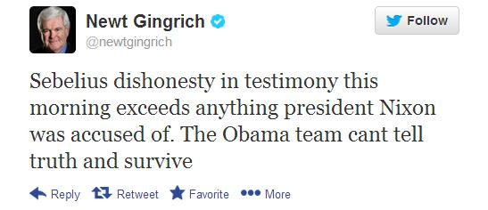 “Sebelius dishonesty in testimony this morning exceeds anything president Nixon was accused of,” Gingrich tweeted.