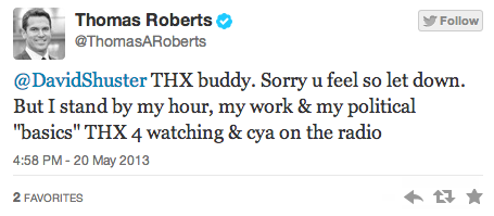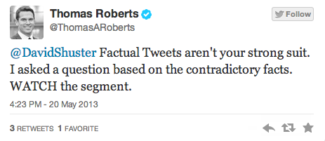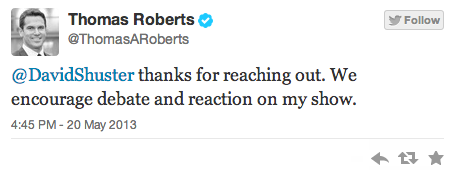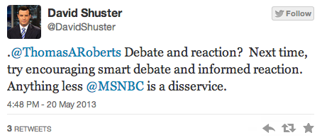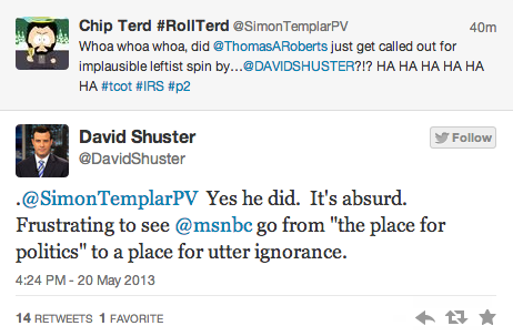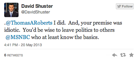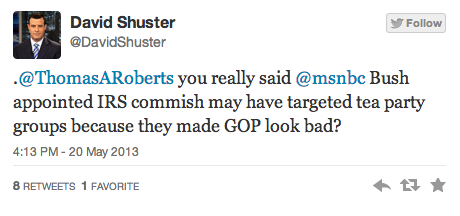 Earlier this afternoon, MSNBC host Thomas Roberts and his on-air panel speculated as to whether the Bush appointee who oversaw the IRS’s intentional targeting of conservative organizations could have been motivated by the fact that tea party groups are seen as having splintered the modern Republican Party. In response, former MSNBC anchor David Shuster gave Roberts a Twitter lashing for engaging in “utter ignorance.”