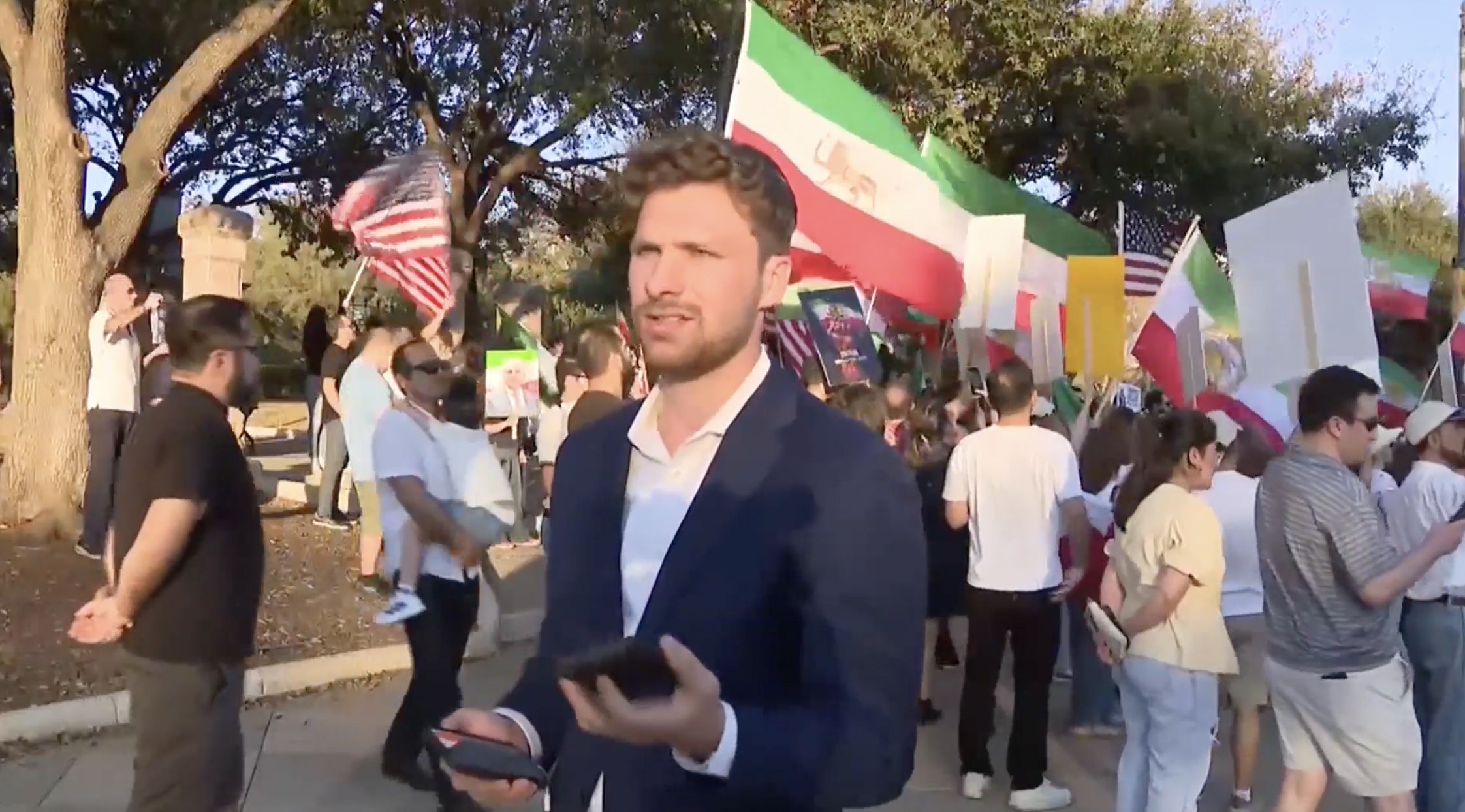 He then appeared to practice a live shot for a moment later before he was handed the CBS Austin microphone. Behind him, rallygoers waved American and Iranian flags and chanted in support of President Donald Trump and Israeli Prime Minister Benjamin Netanyahu.