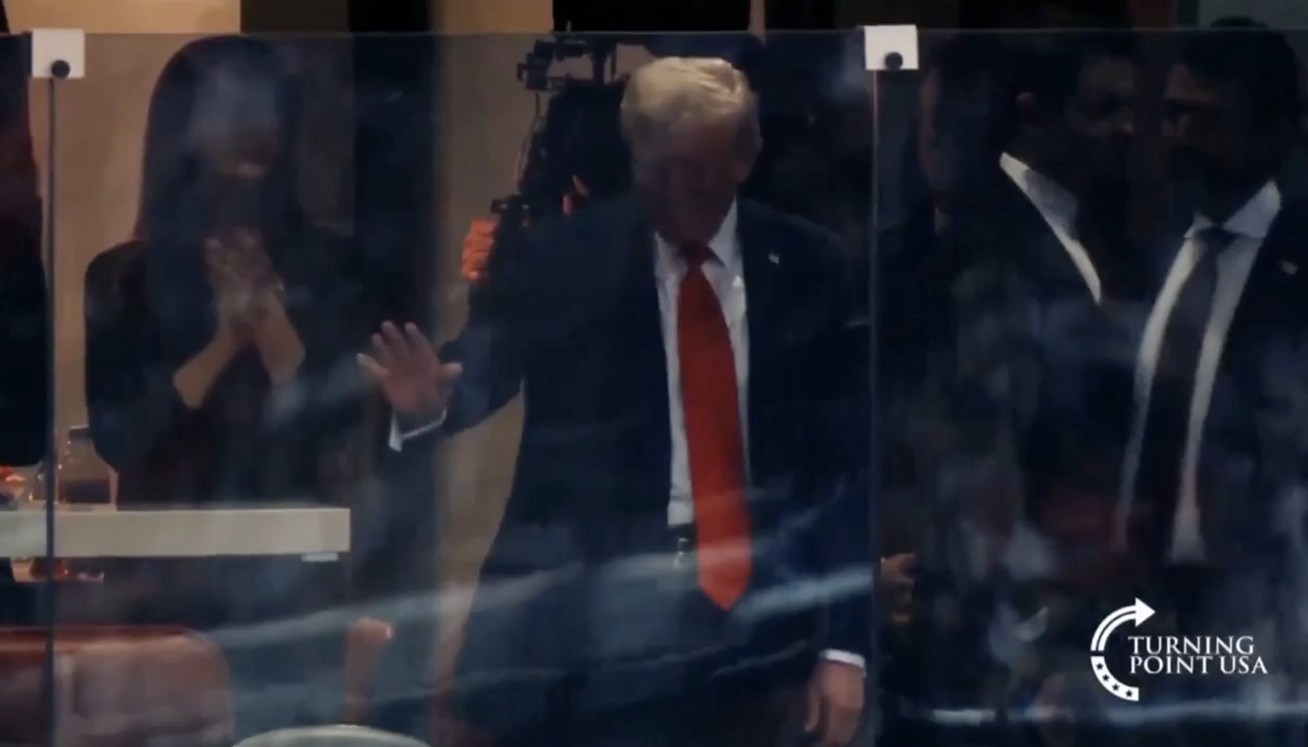 President Donald Trump was met with a loud ovation and chants of “USA!” when he was shown inside his box at the Charlie Kirk Memorial Service on Sunday afternoon.