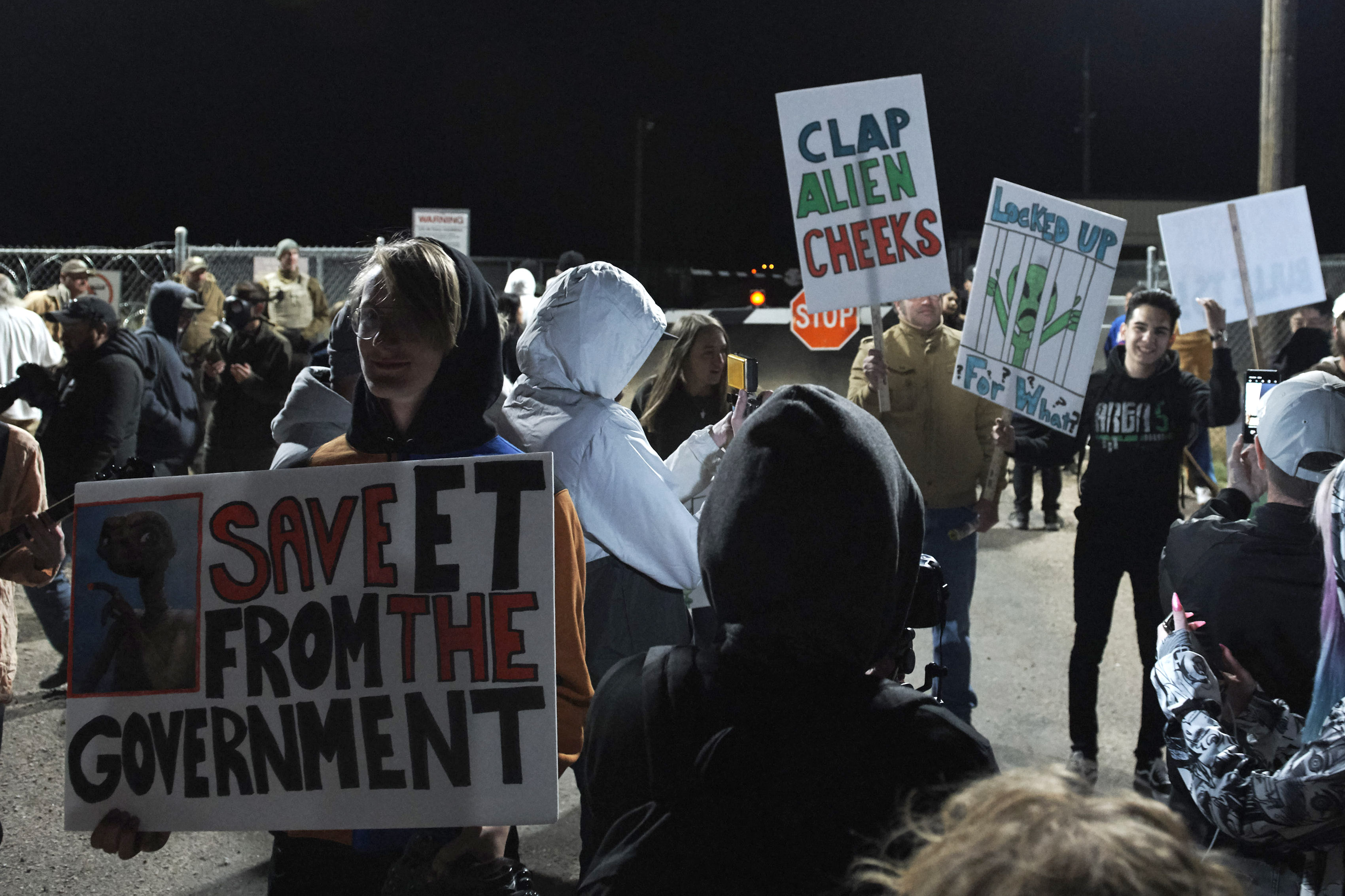 Photographs of the event showed a large group of people with law enforcement by the Area 51 gate, carrying signs that read, “Save ET From the Government,” “Clap Alien Cheeks,” and “Locked Up For What?” along with a picture of an little green man behind bars.