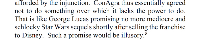 “ConAgra thus essentially agreed not to do something over which it lacks the power to do,” Judge Lee wrote. “That is like George Lucas promising no more mediocre and schlocky Star Wars sequels shortly after selling the franchise to Disney. Such a promise would be illusory.”