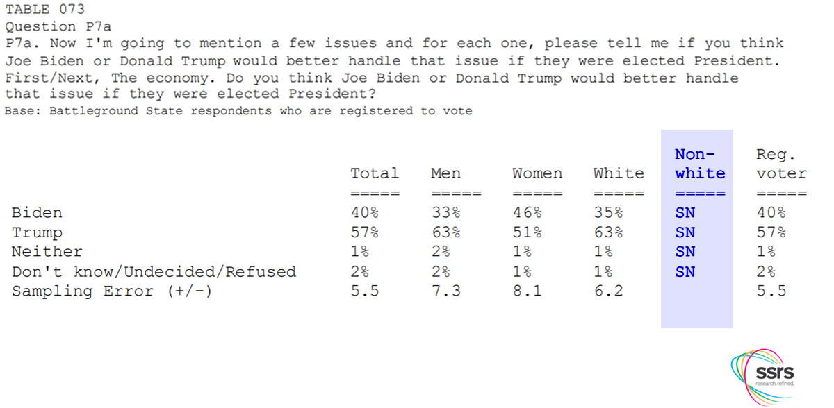 But in the just-released battleground sample, white voters swung massively to Trump, 63 percent to 35 percent for Biden. How did Trump and Biden do with non-white voters? CNN can’t tell you. That column is simply marked “SN.”