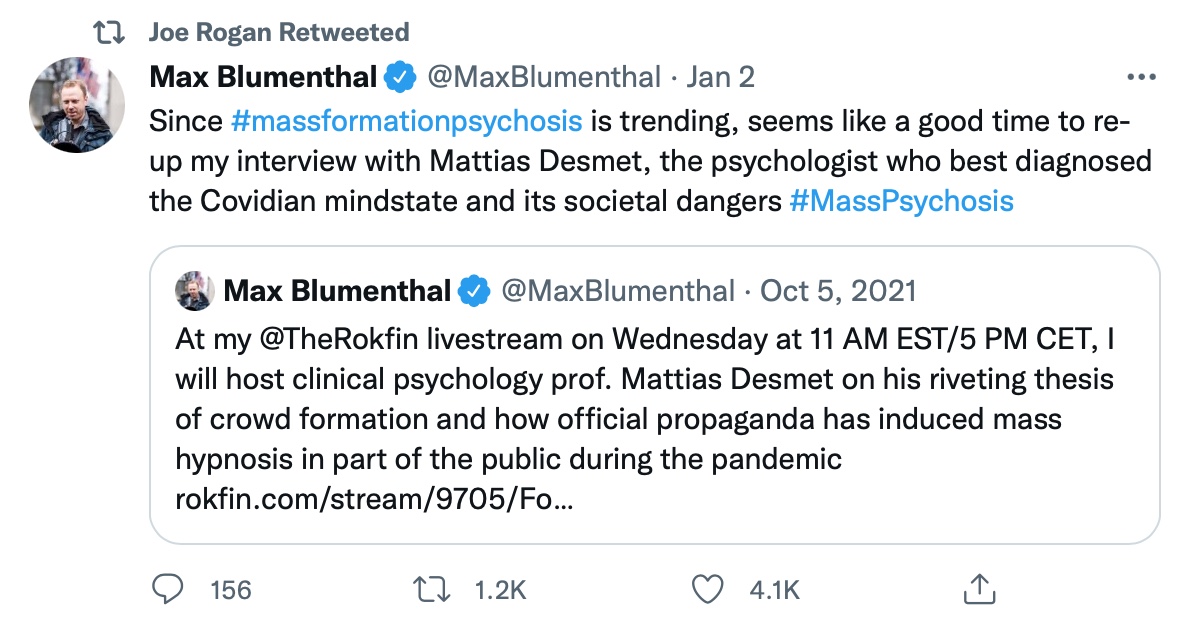 Another question is why Rogan’s post engagement on Gettr is so much higher than on Twitter. For example: On Twitter, Rogan retweeted a post from Max Blumenthal that got 156 comments, 1.2k retweets and 4.1k likes.
