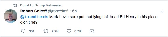 Henry kept pressing Levin on this and after the segment aired, the president took to Twitter to retweet a bunch of people bashing Henry — including a Trump parody account and a man with 201 followers who described the Fox News host as a “lying shit head.”
