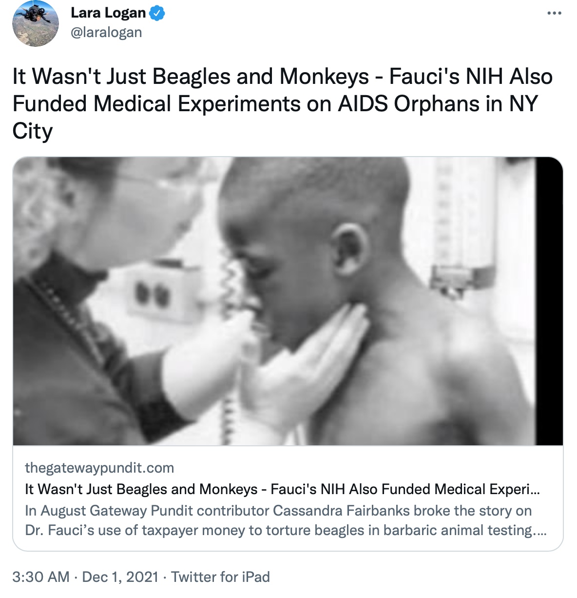 Logan proceeded to tweet out a series of news articles that claimed Fauci promoted and funded the testing of AIDS drugs on foster kids.