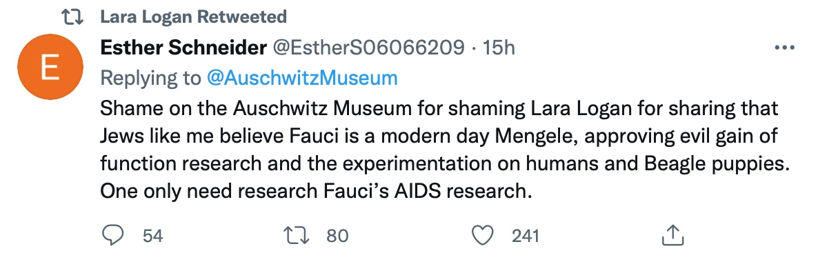 It was Monday when Logan came up with the claim that “people all across the world” are comparing the nation’s top infectious disease expert to the doctor known as the “Angel of Death” for his torture, experimentation and killing of those imprisoned at Auschwitz. Logan’s comments drew condemnation, including from the Auschwitz-Birkenau State Museum, which deemed them a “shameful” exploitation of the Holocaust.