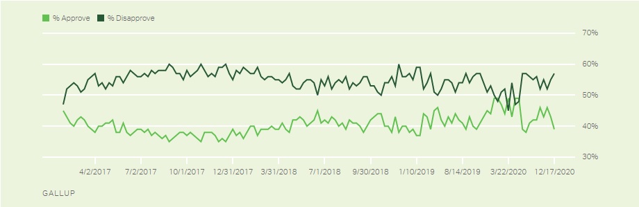 Trump’s approval rating in the Gallup tracking poll — considered the gold standard — fell four points in the most recent survey. He went from 43 percent approval and 55 percent disapproval as of November 17 to 39 percent approval and 57 percent disapproval in the December poll, which means a similar drop would place him at 35 percent in the final Gallup poll of his presidency.