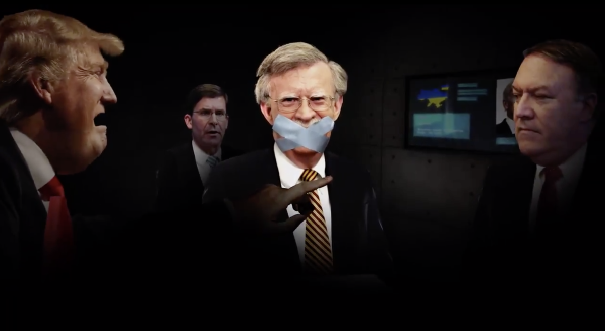 “This is Ambassador John Bolton. He was national security advisor to President Trump. He was in all the meeting, in which the President’s national security team discussed withholding aid from Ukraine, in exchange for announcing investigations into the Biden’s,” the ad roles while picturing Bolton with tape over his mouth flanked by President Trump and Secretary of State Mike Pompeo – with Defense Secretary Mark Esper lurking over Bolton’s shoulder.
