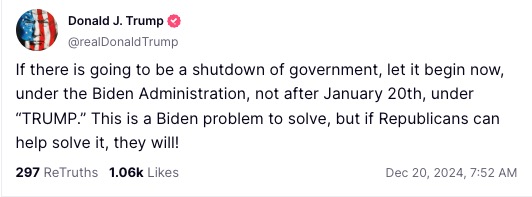 “If there is going to be a shutdown of the government, let it begin now, under the Biden Administration, not after January 20th, under ‘TRUMP.’” the President-elect wrote on Truth Social. “This is a Biden problem to solve, but if Republicans can help solve it, they will!”