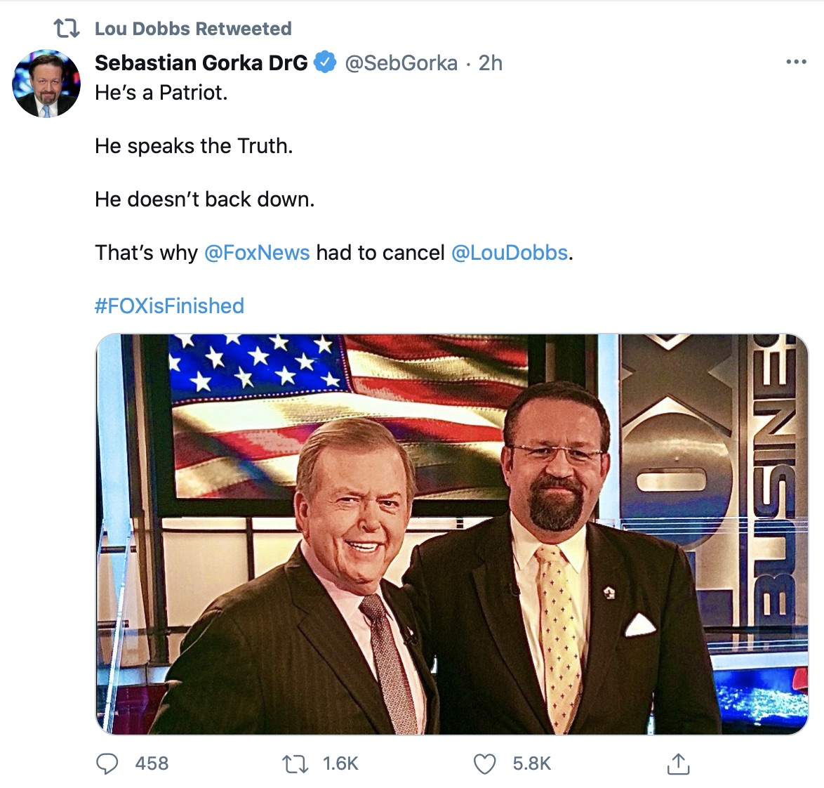 Dobbs also somewhat notably shared tweets from people taking shots at Fox, including Sebastian Gorka, who tweeted with the hashtag “#FOXIsFinished”: