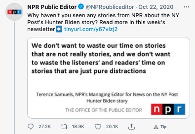 NPR nonetheless made a public display of refusing to cover the issue with an October message on Twitter. “Why haven’t you seen any stories from NPR about the NY Post’s Hunter Biden story?” the publication wrote, before quoting managing editor Terence Samuels. “We don’t want to waste our time on stories that are not really stories, and we don’t want to waste the listeners’ and readers’ time on stories that are just pure distractions,” Samuels said.