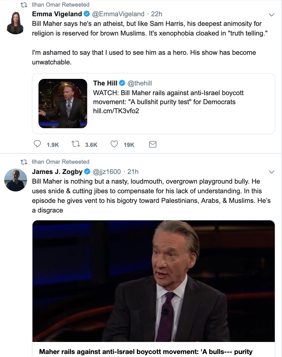 Congresswoman Omar retweeted her colleague and other criticisms of Maher:
