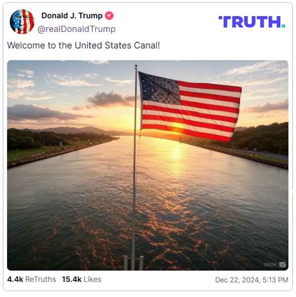 Not long after that, Trump posted the AI image on his Truth Social account with the message: “Welcome to the United States Canal!”