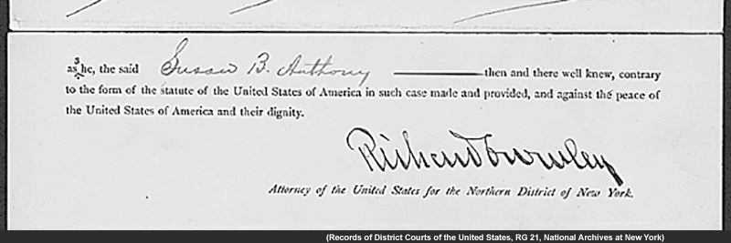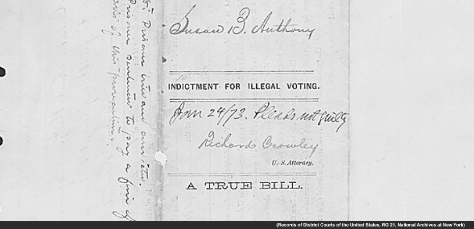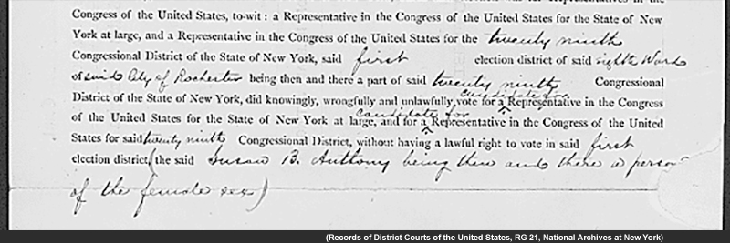 Anthony’s arrest was in Rochester, New York. The indictment read in part that “the said Susan B. Anthony being then and there a person of the female sex” did “knowingly, wrongfully and unlawfully” vote. Her trial was national news at the time, and she was found guilty by an all-male jury.