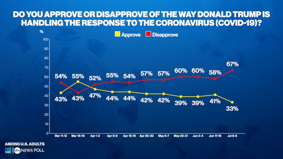According to an ABC News/Ipsos poll published Friday, just 33 percent of Americans approve of the job Trump is doing on the coronavirus, while a whopping 67 percent disapprove. That’s a drop of seven points from last month’s already low 41 percent approval, and the lowest score since the poll began in March.