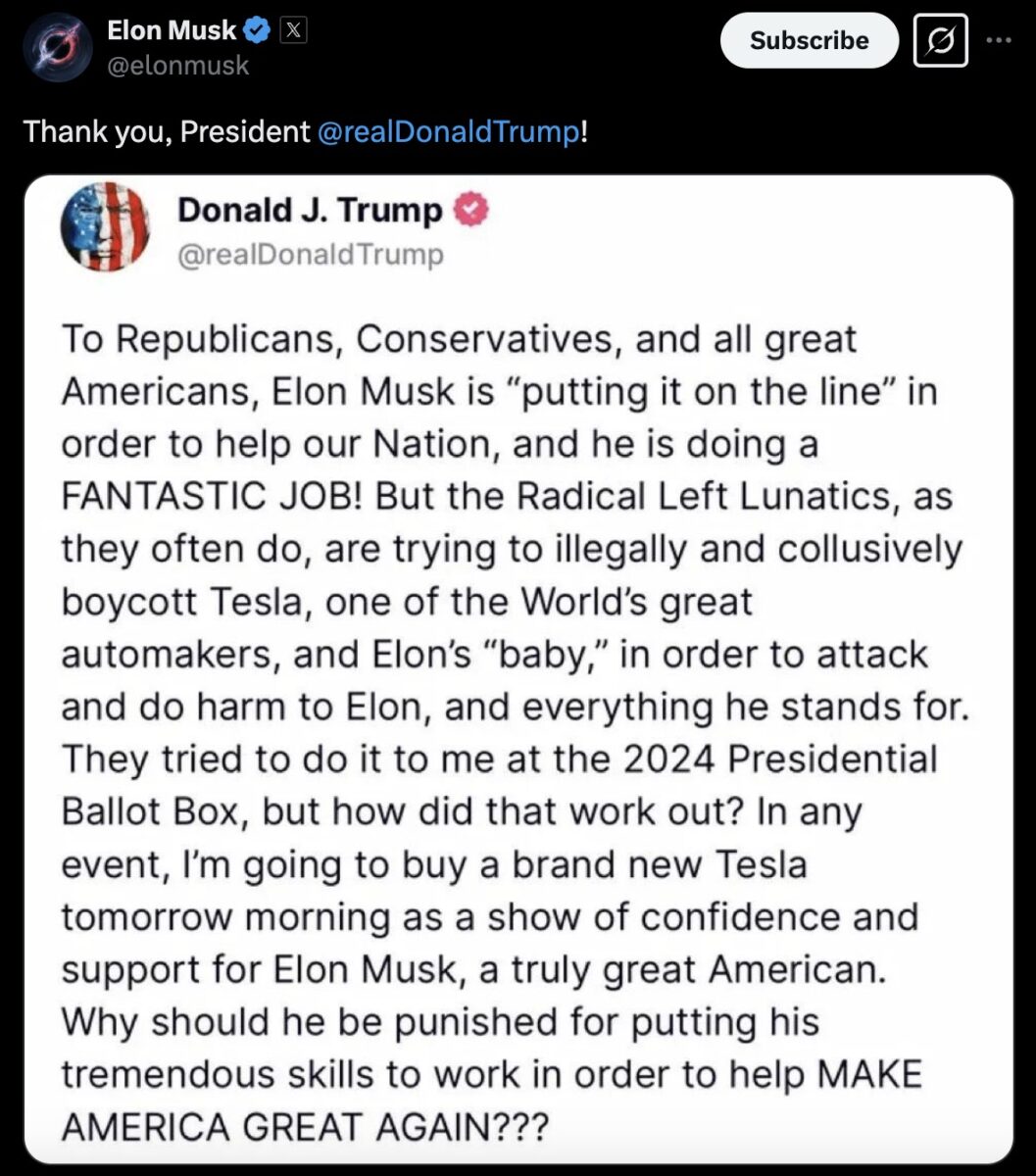 To Republicans, Conservatives, and all great Americans, Elon Musk is “putting it on the line” in order to help our Nation, and he is doing a FANTASTIC JOB! But the Radical Left Lunatics, as they often do, are trying to illegally and collusively boycott Tesla, one of the World’s great automakers, and Elon’s “baby,” in order to attack and do harm to Elon, and everything he stands for. They tried to do it to me at the 2024 Presidential Ballot Box, but how did that work out? In any event, I’m going to buy a brand new Tesla tomorrow morning as a show of confidence and support for Elon Musk, a truly great American. Why should he be punished for putting his tremendous skills to work in order to help MAKE AMERICA GREAT AGAIN???