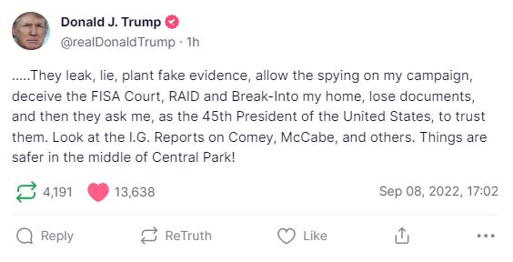 However, Trump also claimed on Thursday, “They leak, lie, plant fake evidence, allow the spying on my campaign, deceive the FISA Court, RAID and Break-Into my home, lose documents, and then they ask me, as the 45th President of the United States, to trust them. Look at the I.G. Reports on Comey, McCabe, and others. Things are safer in the middle of Central Park!”