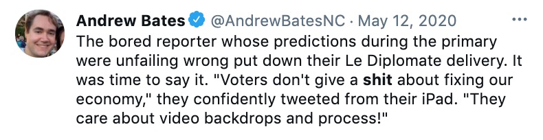 “The bored reporter whose predictions during the primary were unfailing wrong put down their Le Diplomate delivery,” Bates wrote on May 12, 2020, as Biden was locking up his position as the Democratic Party’s presidential nominee. “It was time to say it. ‘Voters don’t give a shit about fixing our economy,’ they confidently tweeted from their iPad. They care about video backdrops and process!'”