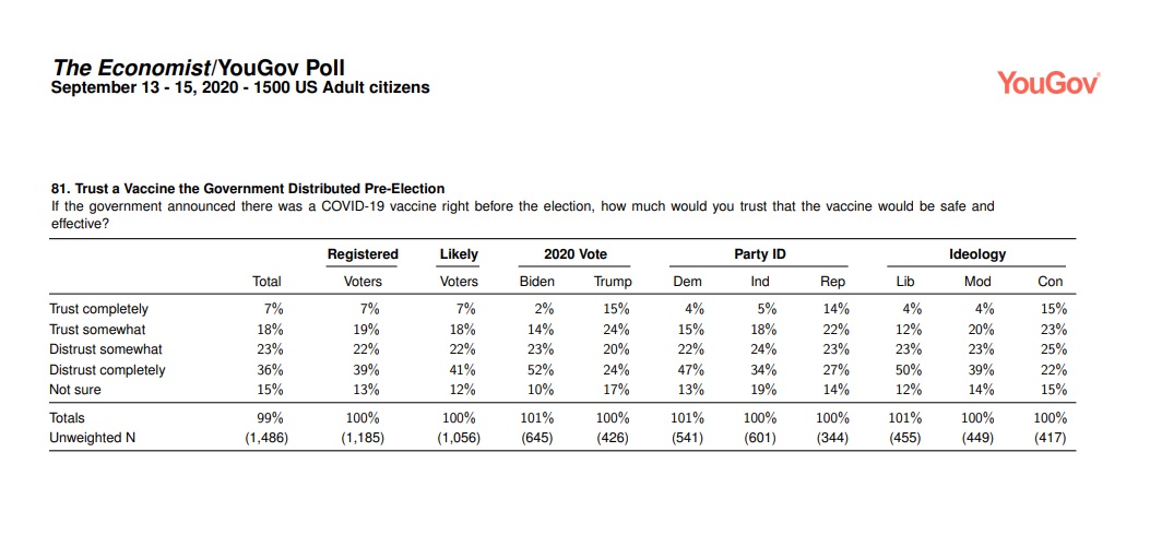 And while there is partisan disagreement on a number of coronavirus-related issues, 50 percent of Republicans agree with the majority that a pre-Election Day vaccine would not be trustworthy.