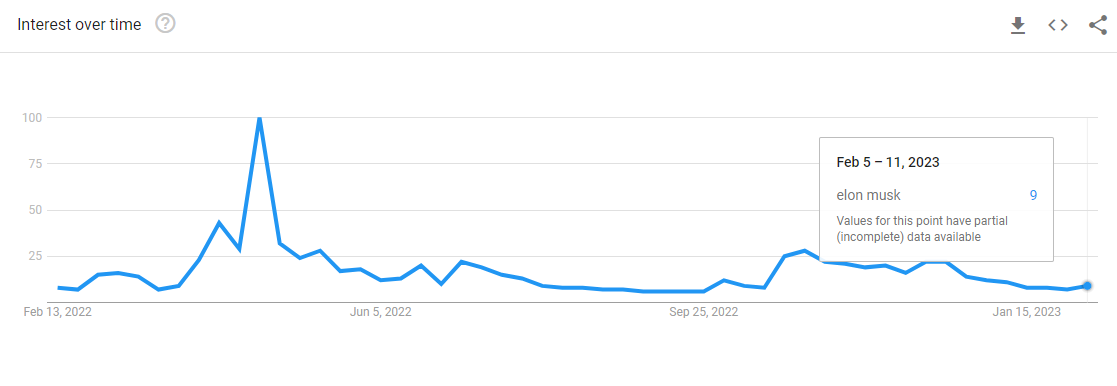 “Employees showed Musk internal data regarding engagement with his account, along with a Google Trends chart. Last April, they told him, Musk was at “peak” popularity in search rankings, indicated by a score of “100.” Today, he’s at a score of nine. Engineers had previously investigated whether Musk’s reach had somehow been artificially restricted, but found no evidence that the algorithm was biased against him,” the Platformer article explained.