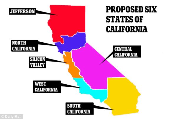 San Diego and Orange County would make up “South California.” “West California” would include Los Angeles and Santa Barbara, while Bakersfield, Fresno and Stockton would make up the larger “Central California.” San Francisco and San Jose would be in the new “Silicon Valley.” “North California” would include the Sacramento area, and “Jefferson” would be home to the Redding and Eureka areas.