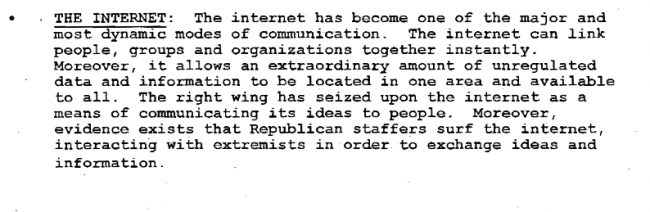“The right wing has seized upon the internet as a means of communicating its ideas to people,” the memo continues. “Moreover, evidence exists that Republican staffers surf the internet, interacting with extremists in order to exchange ideas and information.”